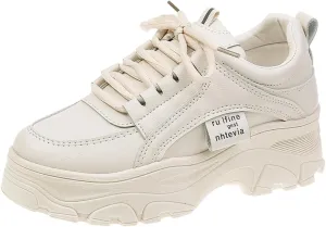 Women's Chunky White Leather Sneakers Fashion Lace-Up Walking Shoes for Women, Comfortable Everyday Casual Gym Shoes